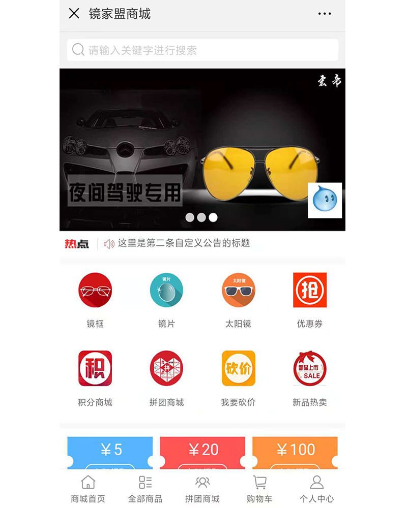 該應(yīng)用是專為眼鏡愛好者的購物公眾號,設(shè)計(jì)開發(fā)積分商城、拼團(tuán)、砍價(jià)等功能模塊。