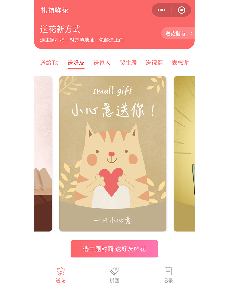 該微信公眾號是專業(yè)的鮮花網(wǎng)絡(luò)購物平臺,應(yīng)用開發(fā)功能模塊有首頁、拼團(tuán)、記錄等等。